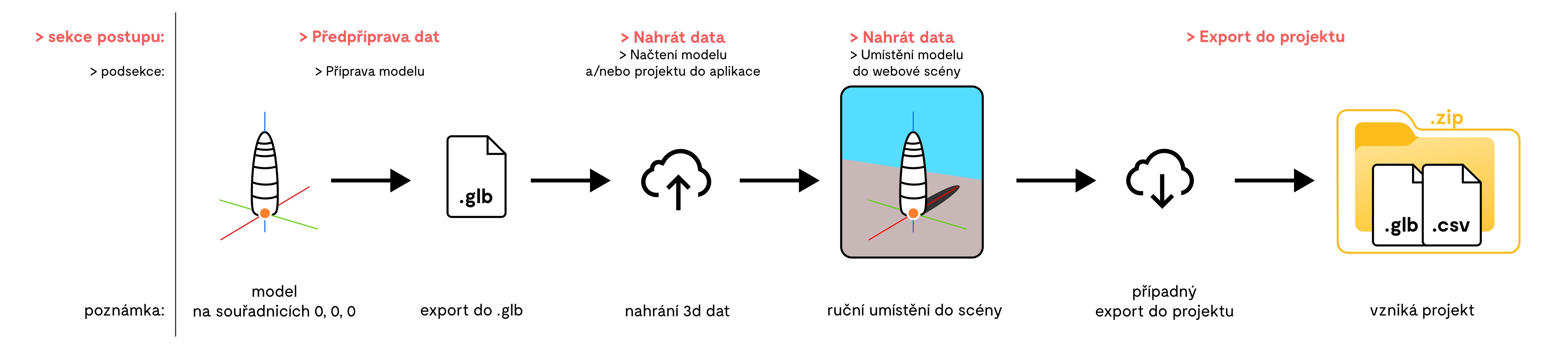 Do aplikace lze nahrát model bez zeměpisných souřadnic ve formátu .glb a ručně umístit do webové scény nebo nahrát projekt ve formátu ZIP v požadovaném schématu s již definovanými zeměpisnými souřadnicemi.