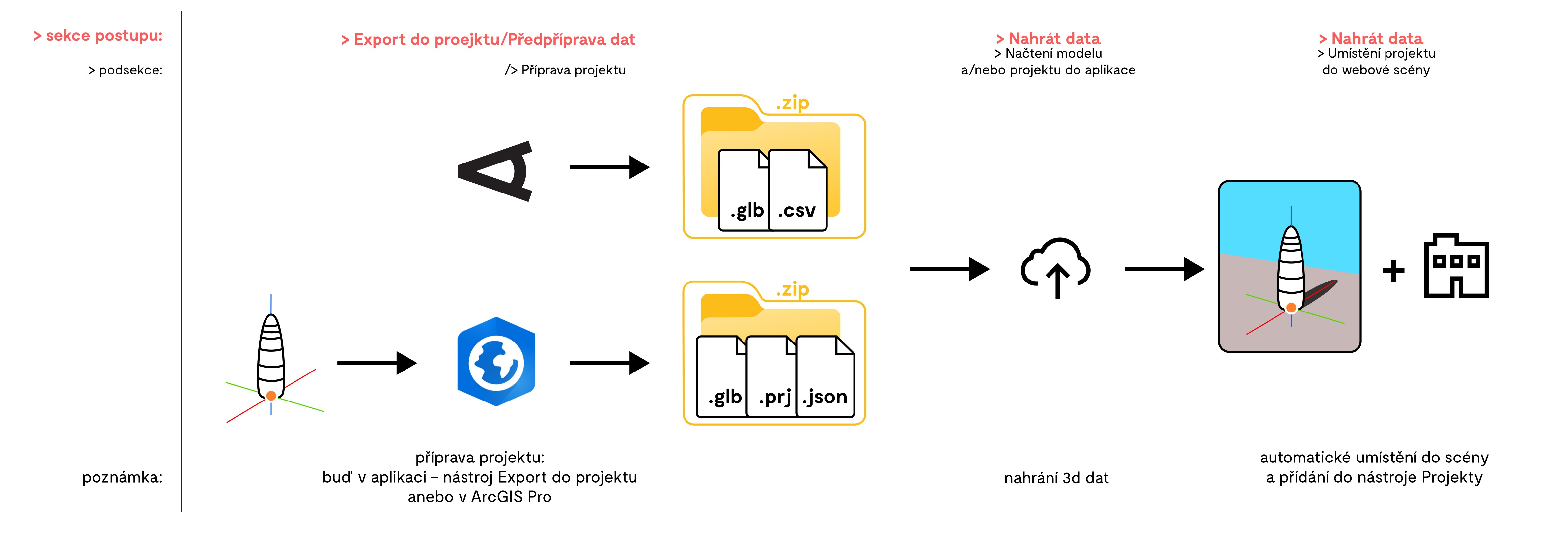 Balíček ZIP od projektu je navíc možné dopředu předpřipravit mimo webovou aplikaci v ArcGIS Pro (více v sekci Předpříprava dat, podsekce Příprava projektu: ArcGIS Pro) a poté stejným způsobem načíst do aplikace. Schéma balíčku je pak částečně odlišné – místo souboru CSV obsahuje soubor .prj s definicí souřadnicového referenčního systému a JSON s metadaty modelu pro ArcGIS Pro.